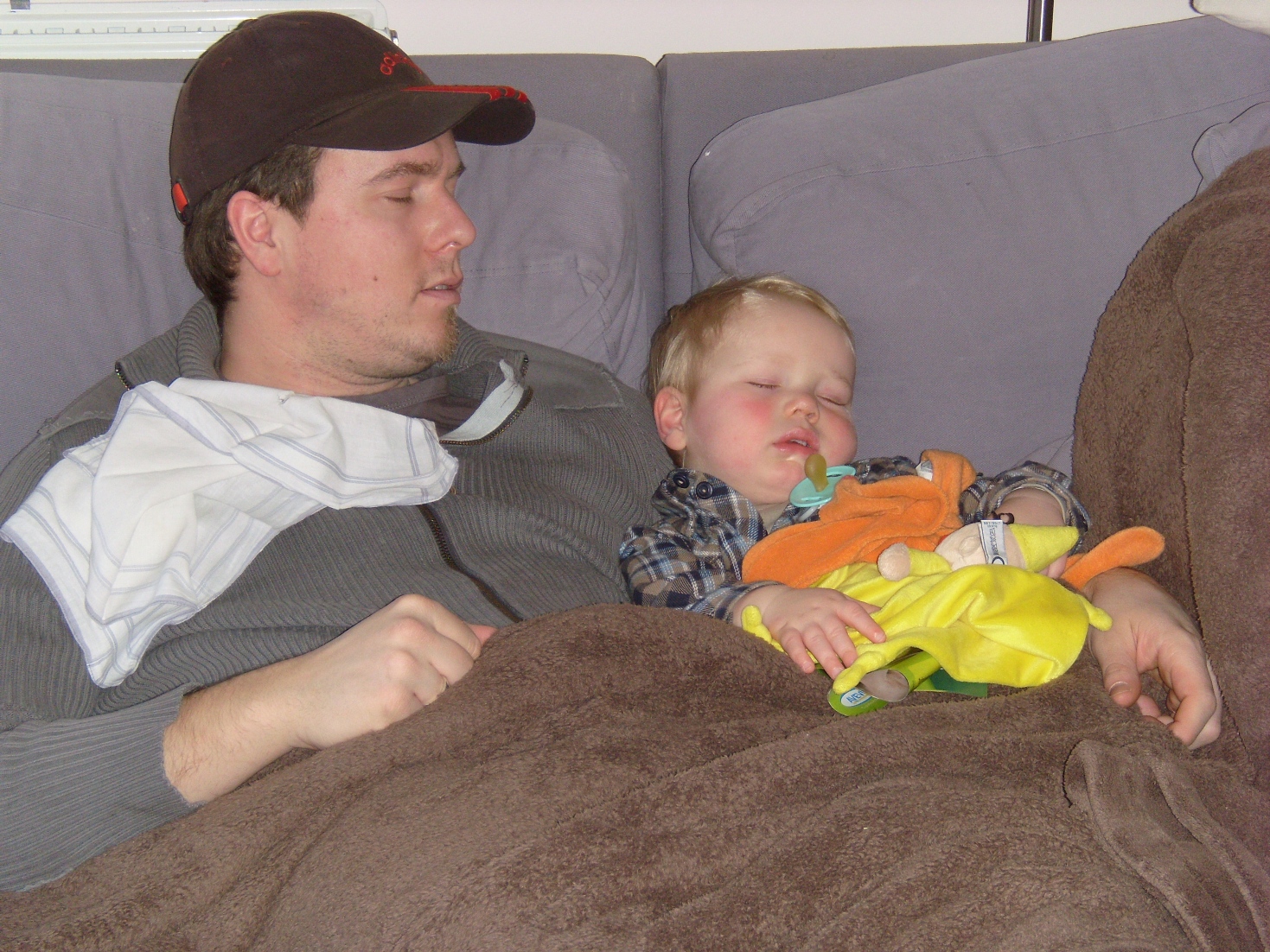 En dan die eerste nacht: Fries slaapt ongeveer 6 uur door aan één stuk. Zo tussen twee uur en acht uur. Gisteren was Benne gaan slapen, en daarna volgden Fries en ouders. Fries wou er echter nog niet al te veel van weten (ondanks de mooie wieg) en besloot om de fuif voor geopend te verklaren. Resultaat: afwisselend kwamen Benne en Fries wakker, Benne werd helemaal chagrijnig en trok ostentatief het deken over zijn oren. Fries trok er zich weinig van aan en bleef huilen. Tot we tot de volgende verdeling kwamen: Steve bleef boven slapen met Benne en Mieke ging naar beneden met Fries. Fries begon direct te knorren van ‘contentement’, Benne volgde al snel, maar sliep niet echt vast. Conclusie: deze middag drie slapers op een rij in de zetel: Benne, Steve (in slaap gevallen tijdens het sportdeel op het nieuws, hoe is het mogelijk…) en Fries. En daarnaast een trotse moeder die nog altijd in een roes door het leven stapt… Tot vannacht…