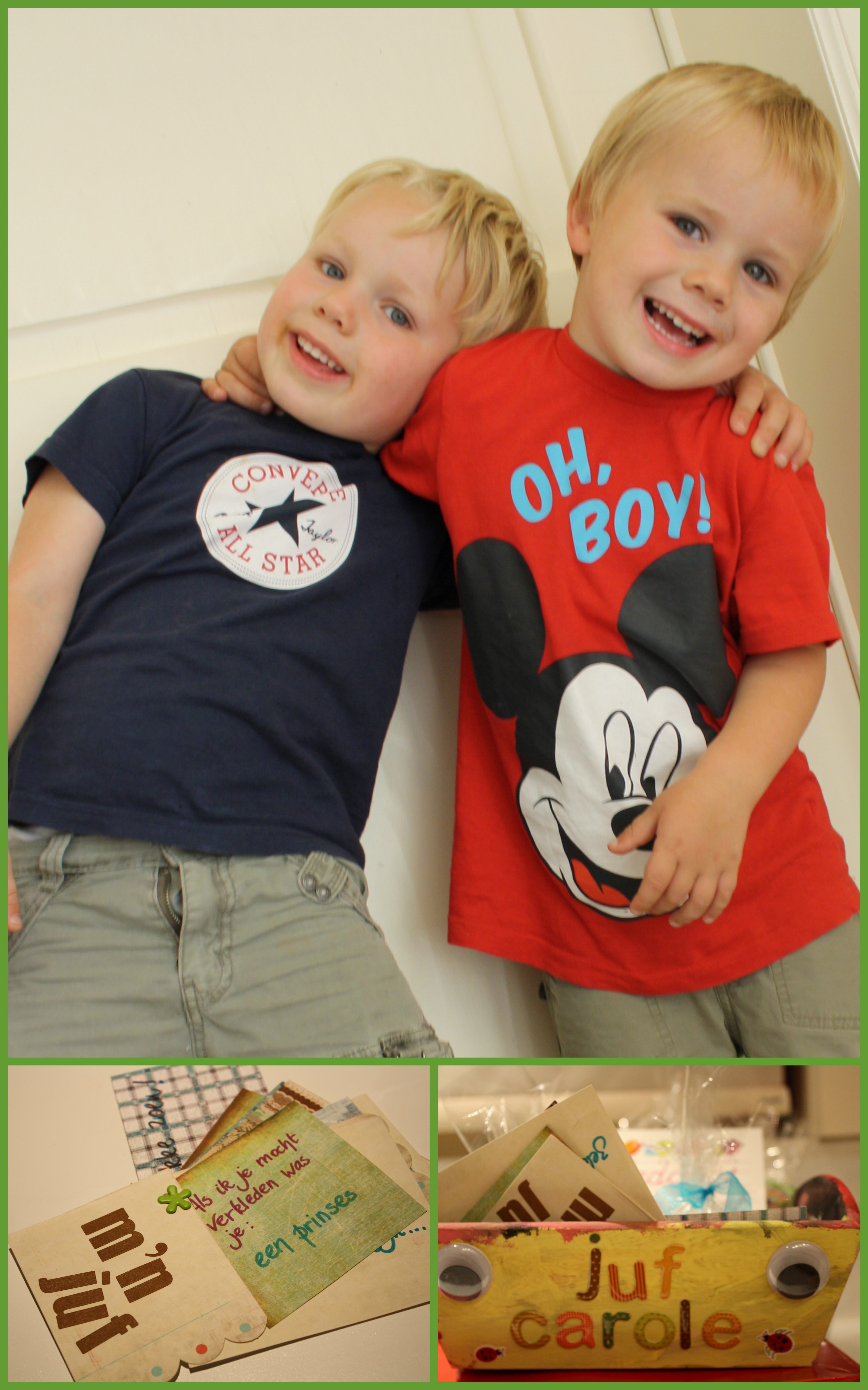 Hopelijk kunnen de twee kapoenen wat genieten in de vakantie, want die twee maanden zijn zo vlug voorbij!! We zullen ze in september terug verwachten, wel bij een nieuwe juf natuurlijk!! Geef ze alletwee nog een dikke knuffel van mij, want ik zal ze ook missen en natuurlijk vooral Fries!!!