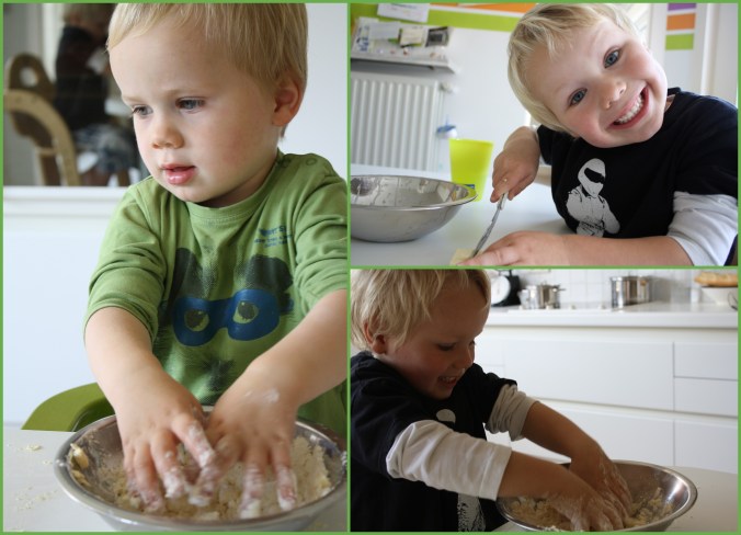 En dus geschiedde. Pedagogische doelstelling van deze activiteit: kinderen betrekken, zelfwaarde, het “hé-ik-kan-iets”-gevoel versterken en zo verder. Er werden dus ingrediënten samengevoegd, zoals dat heet. En toen zagen moeder en kinderen het nog heel hard zitten. Tot de kinderhandjes zich ook zouden mengen in de ingrediënten. Na een paar keer de opmerking gekregen te hebben dat dit toch wel heel vieze koeken zouden zijn, werden de kinderhanden afgespoeld en namen de iets grotere handen de controle. Tempo tempo, ’t moest een beetje vooruit gaan. Tenslotte was het al zondagnamiddag.