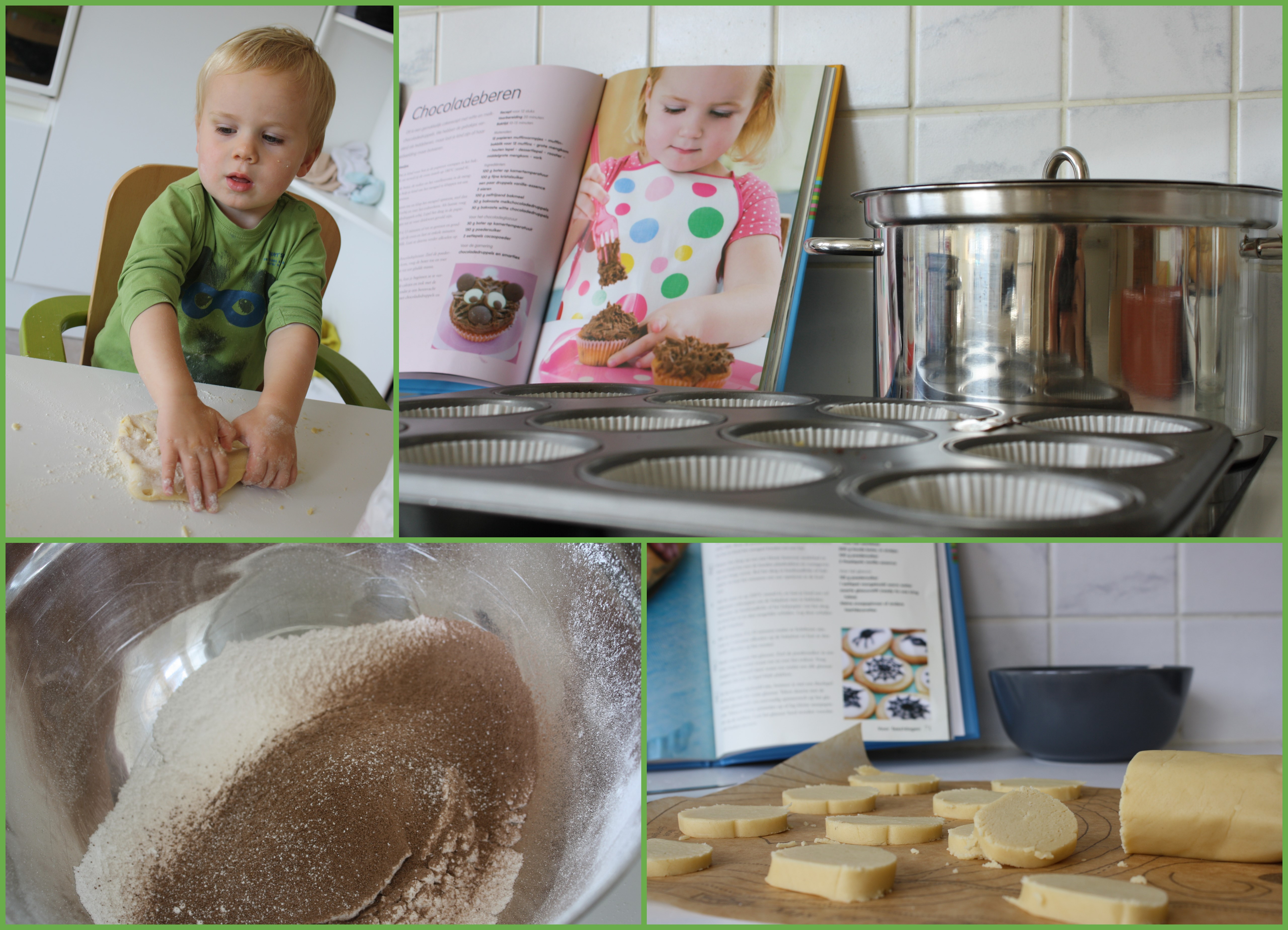 Enfin. Fase twee van de werken. Zonen hadden zich intussen al verschanst tussen speelgoed en televisie, zodat de moeder in haar eentje van de hele keuken een slagveld moest maken. Immer van haar plicht bewust besloot ze dan ook om dit met volledige overgave te doen. Meer zelfs, alle waarschuwingen voor zelfoverschatting ten spijt werd zowaar besloten om twee (2!!) ‘dingen’ te bakken. Koekjes en cakejes, jawel!