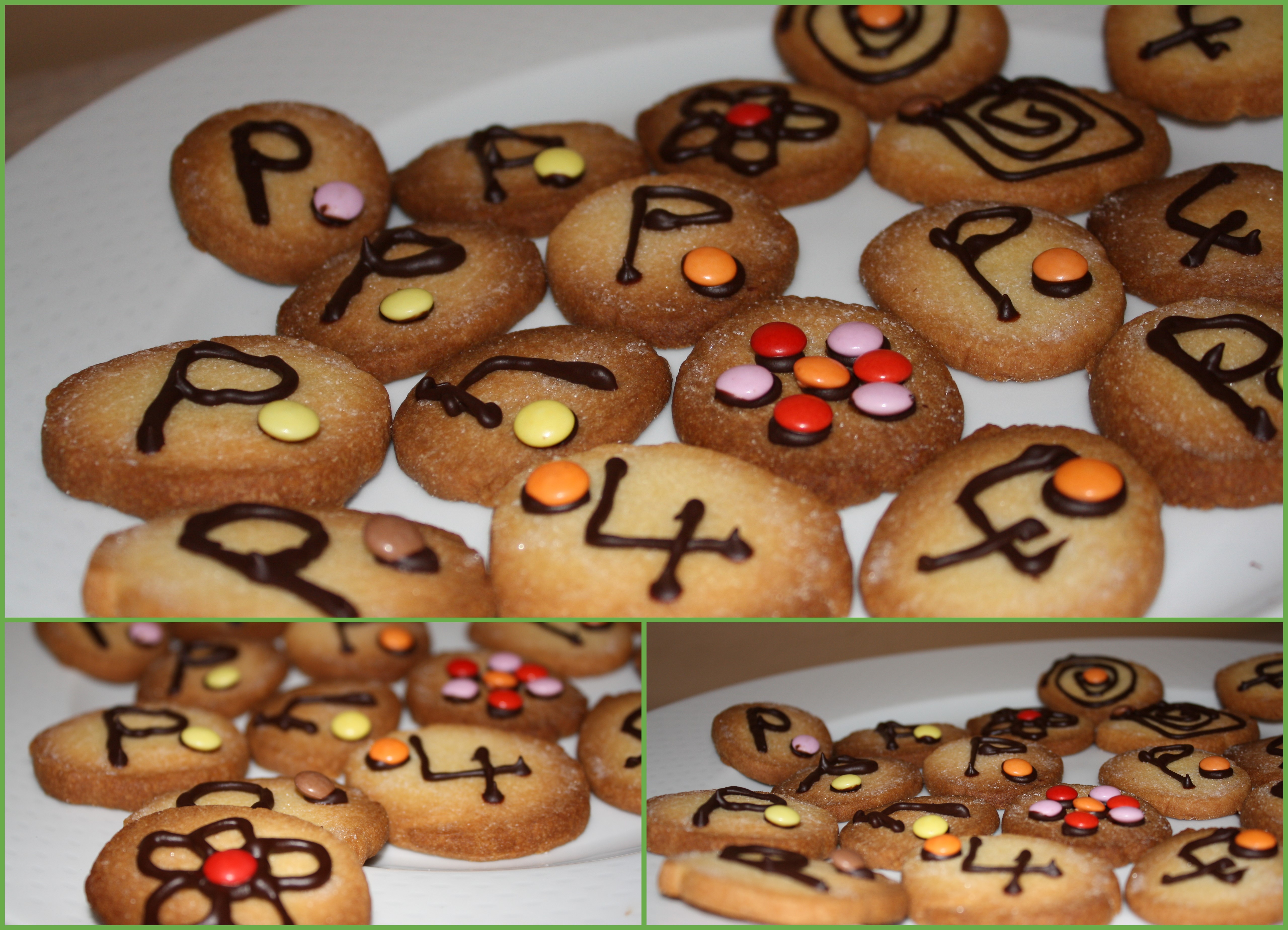 Tot! Tot! Tot! Moeder met een nieuw plan kwam (ja, we spreken hier over een doorzettertje): chocoladeversierselkens op de koekjes aanbrengen. Ergens nog een spuit uitgehaald, chocolade laten smelten (oo bain marie natuurlijk), en in opperste concentratie de ‘P’ (“stokje en buikje boven hé mama”), de ‘4’ (“mo ség, da moet wel recht hé mama”) en een occasioneel bloemetje (bakken voor gevorderden) en hartje (voor de DrieSterrenPeter) op de koekjes gooien.