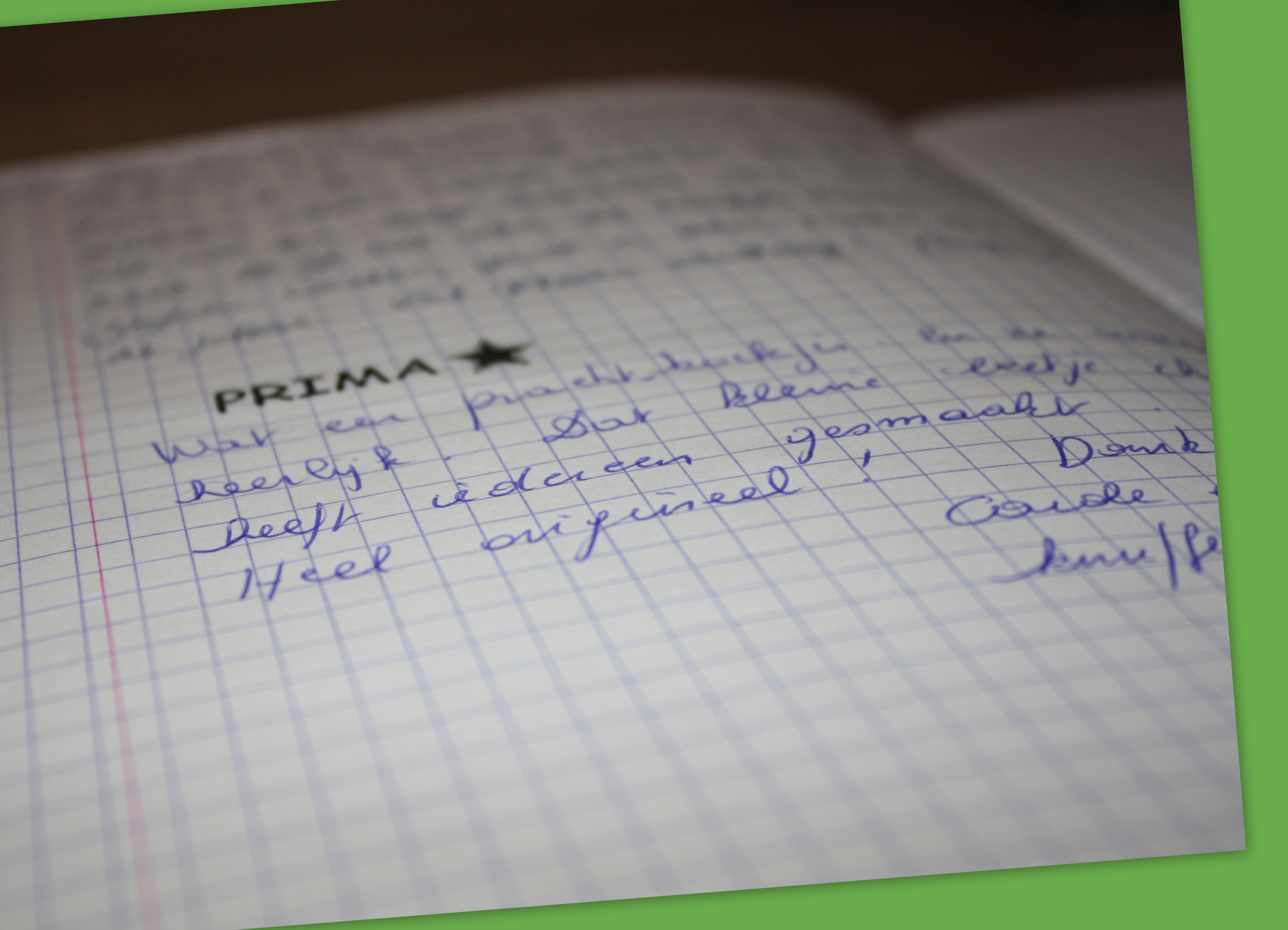 En kijk! Toen de moeder die avond thuiskwam zag ze zowaar een berichtje van de juf. Met trillende vingers werd het boekje van de oudste zoon opengeslagen en wat toen gebeurde kan geen mens beschrijven: de vreugde, de intense blijheid, het gevoel van puur, intens kindergeluk. De moeder had zowaar een stempel gekregen van de juf! Het was het waard, elke seconde van pure inspanning…